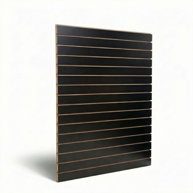 - A-kwaliteit MDF panelen. Deze slatwall panelen zijn 18 mm dik en dubbelzijdig voorzien van een melamine toplaag. (kleur voorzijde is gelijk aan kleur achterzijde)
