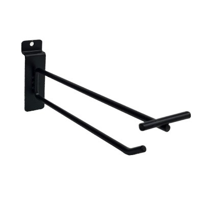 Eurohaak (dubbele blisterhaak) voor gebruik in slatwall - lamellenwanden. Mooie en stevige kwaliteit. Ideaal voor het netjes presenteren van allerhande producten op de plaats van verkoop.